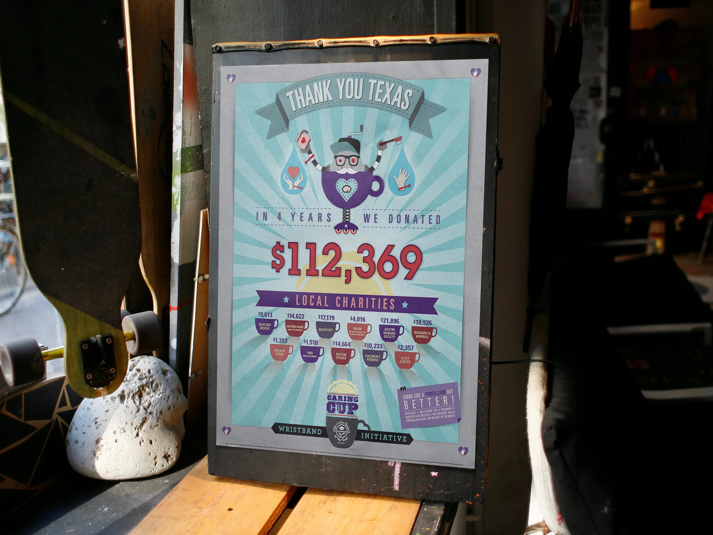 By purchasing a wristband for a minimum $1.00 donation, customers receive a 10% discount on all prepared beverages for the rest of the month. 100% of the proceeds go to a local nonprofit partner.